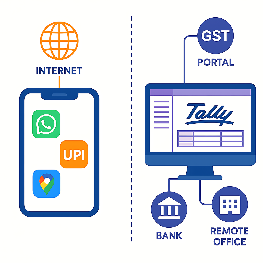 Think of TSS in Tally as an annual subscription that keeps your Tally connected with the outside world. Just like your smartphone needs the internet to run WhatsApp, UPI, or Google Maps - your Tally needs TSS to connect with GST portals, banking systems, and even your own branches.